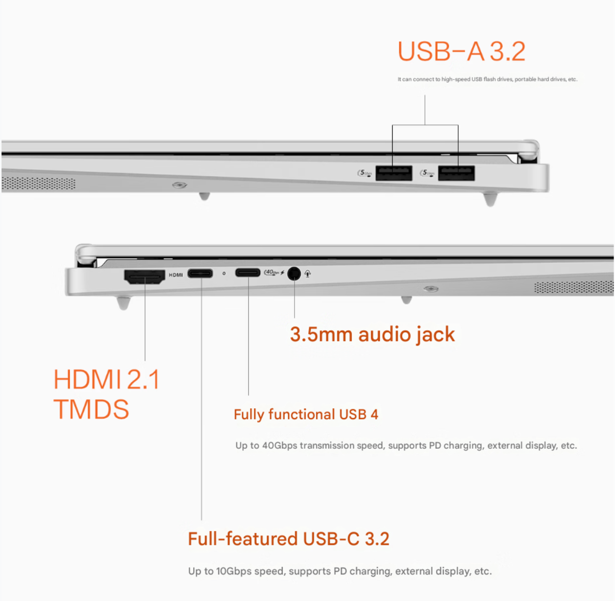 | Cổng kết nối: | 1x HDMI 2.1 1x USB 3.2 Type-C, support DP, PD 1x USB 4 Type-C, support DP, PD 2x USB Type-A 3.2 1x Jack tai nghe/micrô |