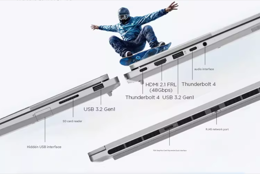 | Cổng kết nối: | 1x Cổng TGX (cắm eGPU) 1x USB 3.2 Gen 2 Type-C, 1x USB 4.0 Type-C 1x HDMI 2.1(48Gbps) 1x USB 3.2 Gen 1 Type-A, 1x Headphone / mic combo 3.5 1x RJ45 2x USB 3.2 Gen 1 Type-A 1x SD |