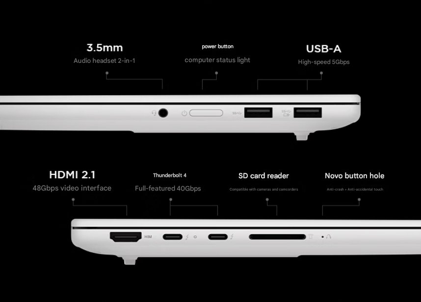 | Cổng kết nối: | 2x USB-A 3.2 Gen 1 5Gbps 1x SD Card Reader 2x USB-C 4.0 (support 40Gbps data transfer, Power Delivery 100W and DisplayPort™ 2.1) 1x HDMI 2.1 1x Headphone / microphone combo jack (3.5mm) |