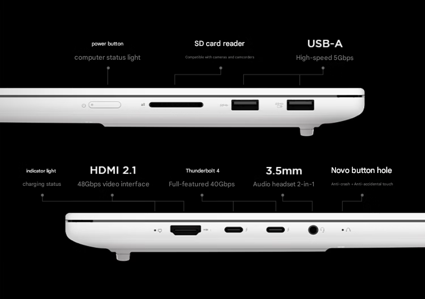| Cổng kết nối: | 2x USB-A 3.2 Gen 1 5Gbps 1x SD Card Reader 2x USB-C 4.0 (support 40Gbps data transfer, Power Delivery 100W and DisplayPort™ 2.1) 1x HDMI 2.1 1x Headphone / microphone combo jack (3.5mm) |